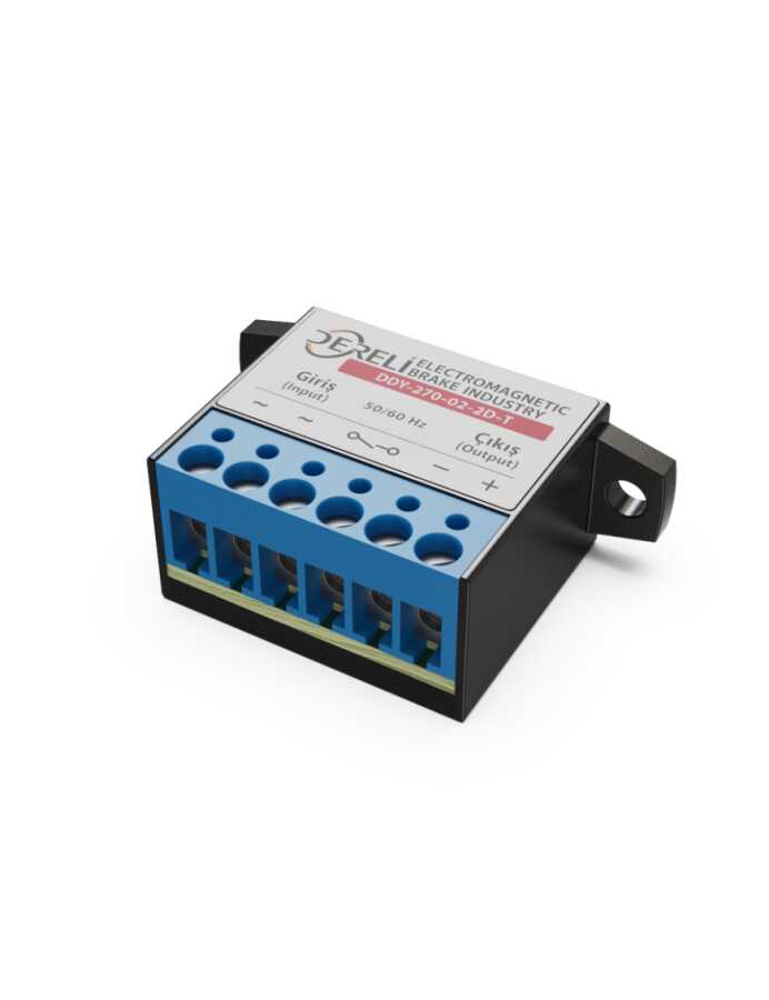 DERELİ FREN DDY 270 02 2D T Teknik Detaylar Maksimum Besleme Voltajı (Uin): 270 V AC Çıkış Voltajı (Uout): Uin X0,95 V DCDoğrultucu Akımı (IN 45°): 2.5 ADoğrultucu Akımı (IN 80°): 1.5 A Genellikle, vinç kaldırma sistemleri ve eğimli çalışan sistemlerde kullanılır.